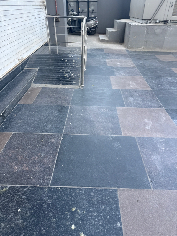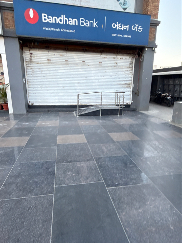There is a ramp with one side railing at the entrance of the building. Its a less accessible place for SAP