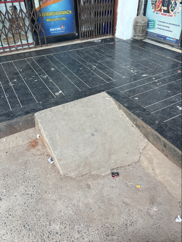 Provided small size slope without any support or railing, it is less accessible for wheelchairs and SAP.