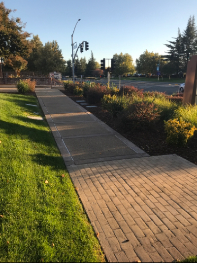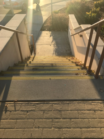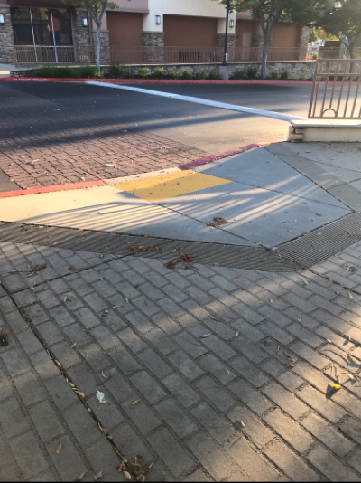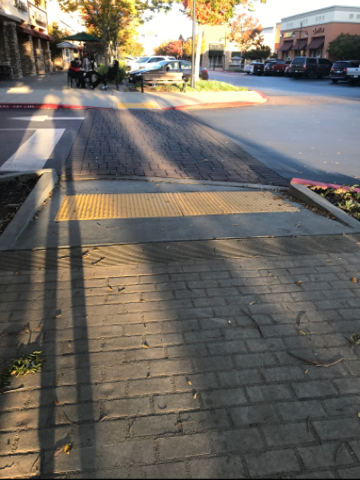 There is a wide, ramp from road to sidewalk. There is a longer ramp on other side, but has no railings and not very wide. There are stairs with railings on both sides.