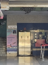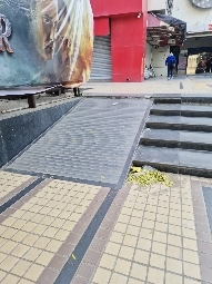 There is a ramp at the entrance, but it does not have any railing for support. There is an elevator to access the above floors