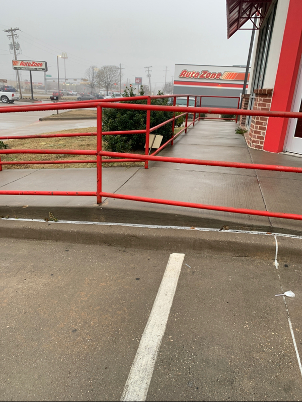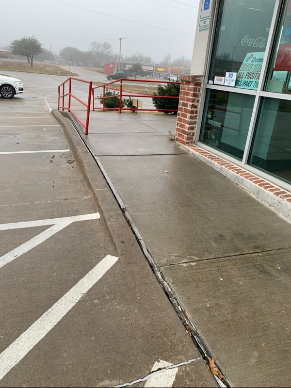 There is a ramp with a handrail near the entrance, it abruptly cuts off at the end which makes it difficult in terms of accessibility. On the other side, there is a nice slope leading to the sidewalk but the rails start later on.