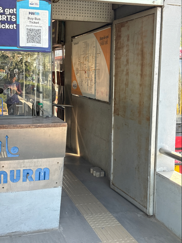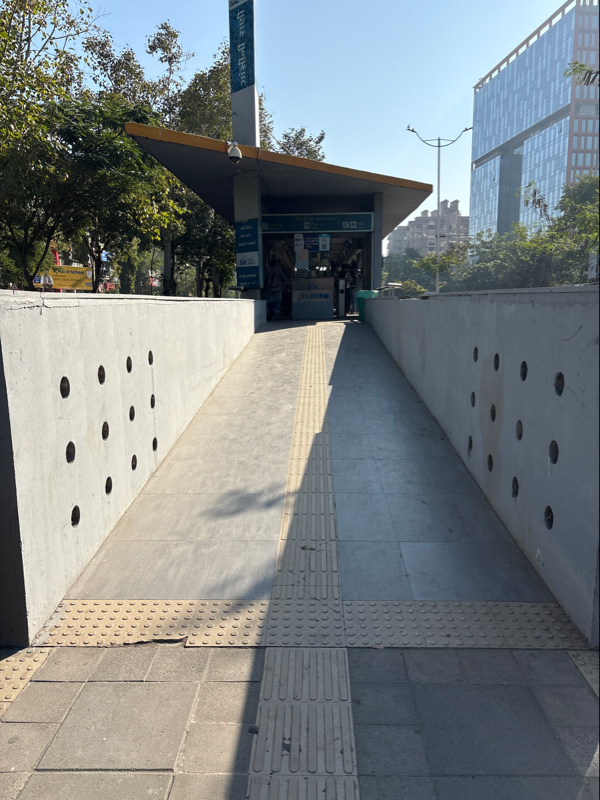 The entrance is narrow, and there is a ramp on both sides, but there is no railing for support, which makes it less accessible for SAP