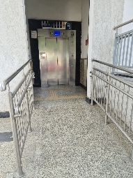There is a ramp with a railing that leads to the elevator of the station, which is accessible for SAP