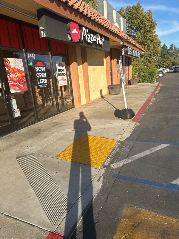 Ramp to enter sidewalk. Open space, little obstruction. Door may be difficult to operate.