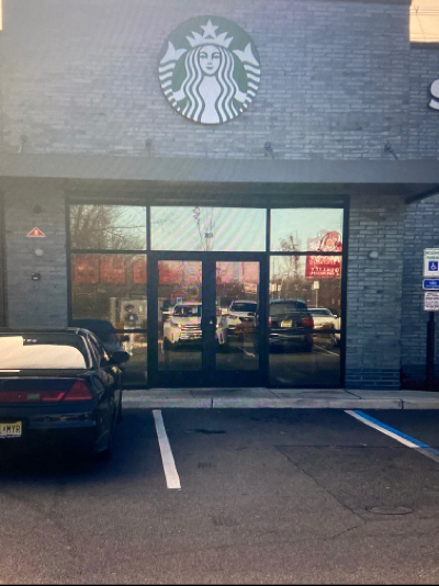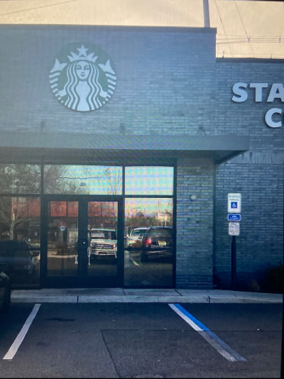 Has special parking spots and a small slope built into the sidewalk. No handrails for slope