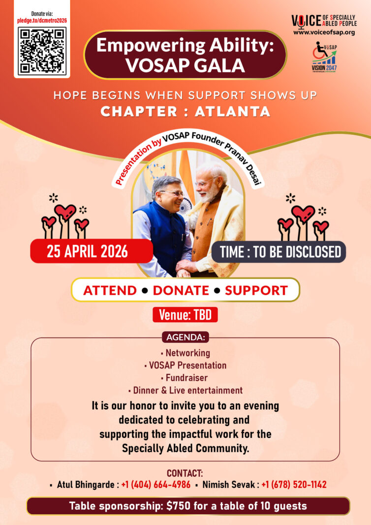 Driven by the message “Hope begins when support shows up,” the Atlanta Chapter Gala will highlight VOSAP’s mission to create meaningful impact through advocacy, accessibility, and empowerment, aligned with the organization’s long-term Vision 2047. A central highlight of the event will be a presentation by VOSAP Founder, Shri Pranav Desai, who will share insights into VOSAP’s journey, its growing global footprint, and the transformative initiatives empowering persons with disabilities.